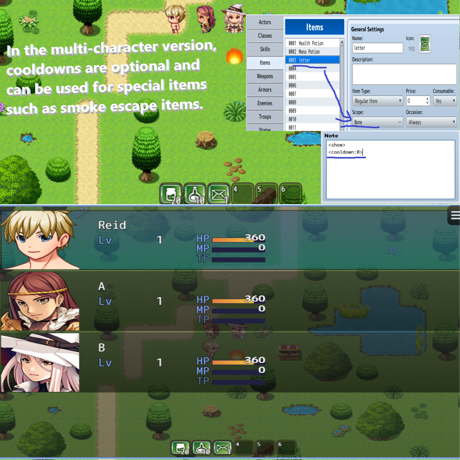 CF Map Toolbar adds a simple 6-slot item shortcut toolbar to the map screen in RPG Maker MZ.