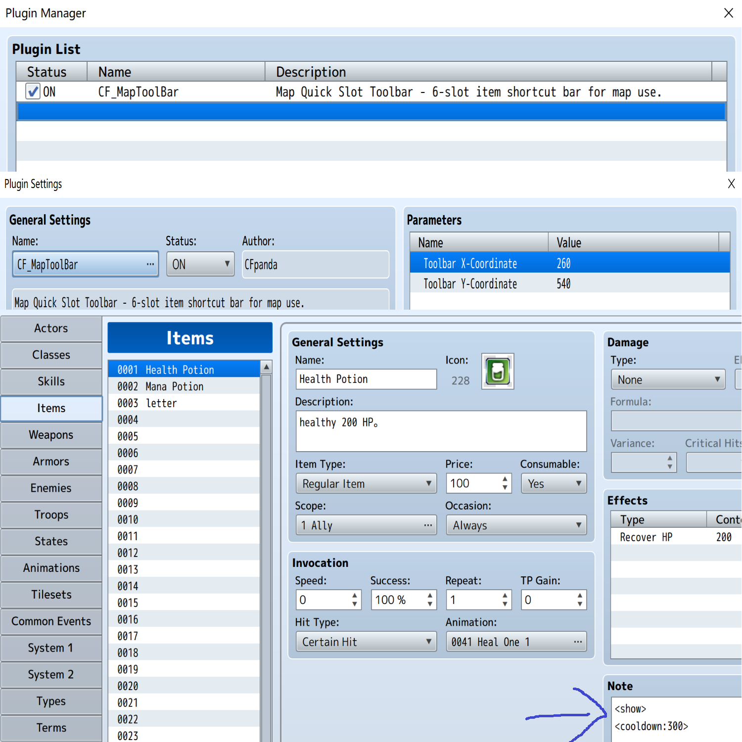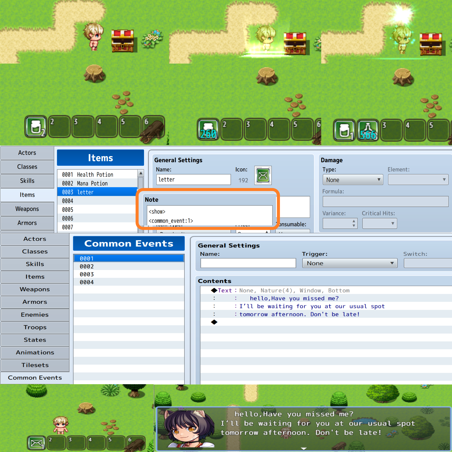 Toolbar items can use normal item effects, play item animations on the player, and also trigger Common Events. This makes it useful not only for consumable items, but also for custom map actions, interactive tools, special effects, or event-based systems.